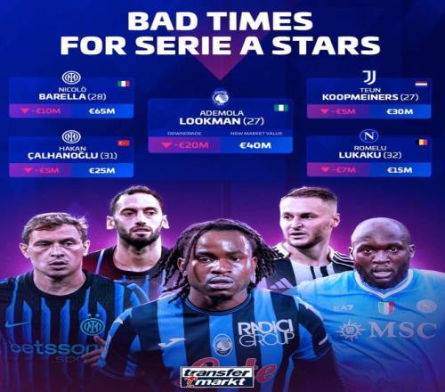 意甲身价跌幅榜:卢克曼跌幅最大,国米3人下跌1000万