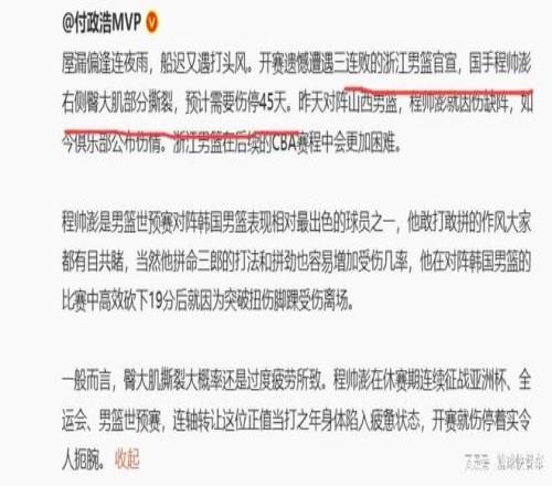 可屋漏偏逢连夜雨,浙江队最近状态欠佳,他们的主力锋线球员程帅澎又因伤,不得不伤停45天。根据浙江对官方最新消息,程帅澎因为右侧臀大肌部分撕裂,预计将伤停45天。对于目前的浙江队来讲,这确实是一个非常大的打击。本赛季,他们的战绩就不大理想。现如今,球队主力锋线尖刀,又因伤无法出战,球队一下子就失去了一个战斗力核心,按照浙江队本赛季的状态,没有了程帅澎后,他们想要重返八强,恐怕更难了。