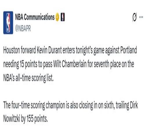 目前总得分31405分的杜兰特,距离第六位也无需等待太久。他与德克-诺维茨基的31560分之间也仅差155分,大概率能在火箭队接下来的主场系列赛中完成超越。
